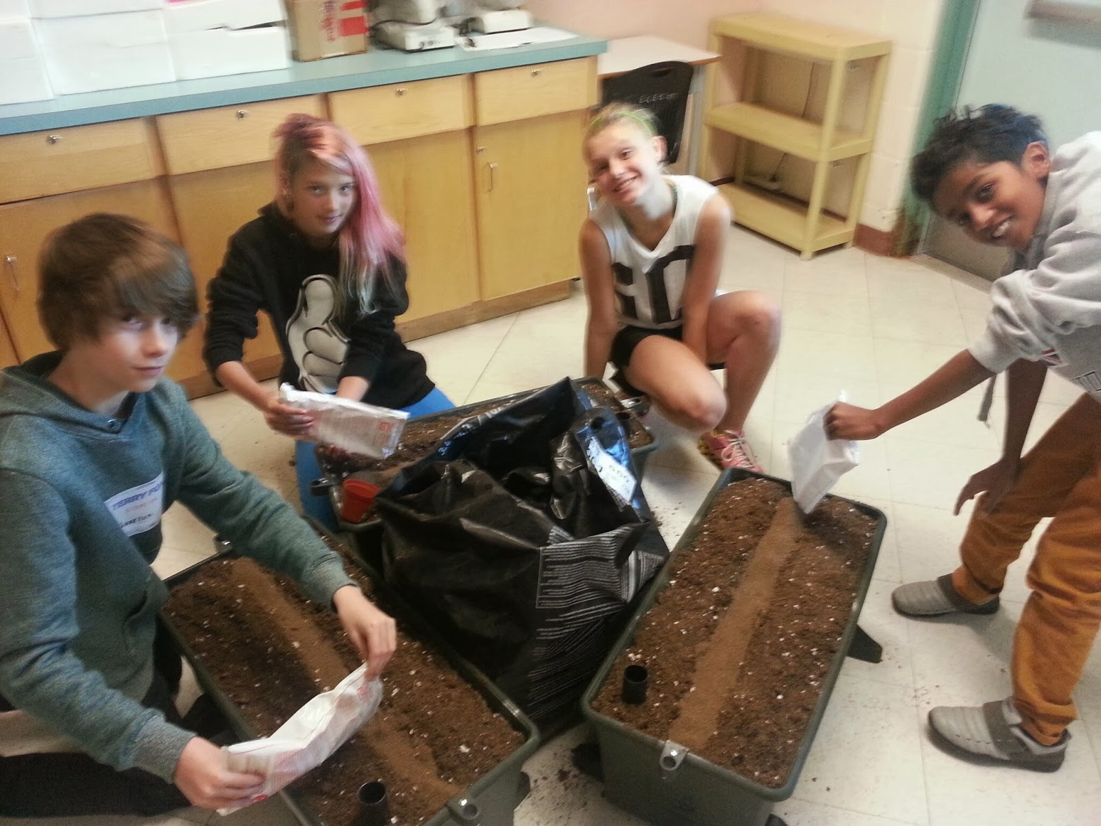 Today the 7F1 class got to help me plant our Earth Boxes! (Don't worry 7F2 you get to do the compost garden next week!). Fall is not the ideal season for planting and as the days get shorter I am not sure if this is going to work. I piloted an Earth Box project at my old school in Wetaskiwin and it was a huge success. We had TEN Earth Boxes and were able to grow enough food to have salad and make soup as well as tomatoes for everyone. This year I have borrowed three boxes (I gave one to Mrs. Buzak) and so we will try our humble garden out. We will also replant in late January (when I usually plant) and compare to see which garden was more successful.